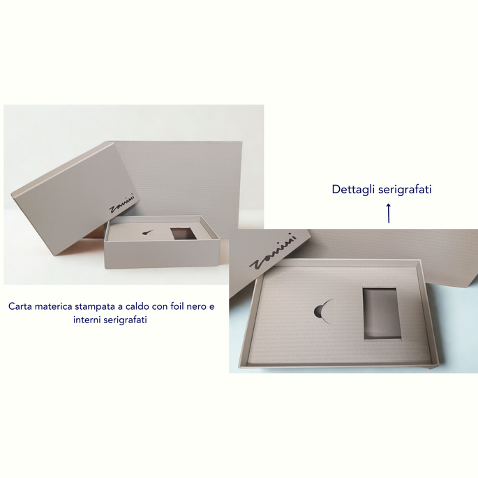 Scatole fondo e coperchio rivestite con materiali di alta qualità, le nostre scatole possono essere nobilitate con diverse tecniche, tra cui stampa a caldo e serigrafia trasparente, per un risultato elegante e su misura.